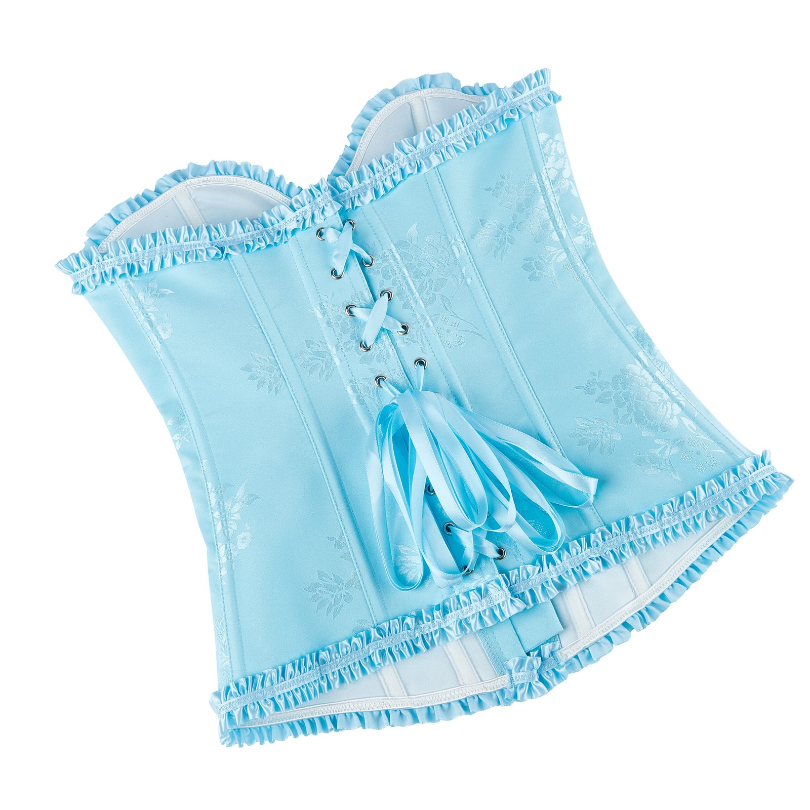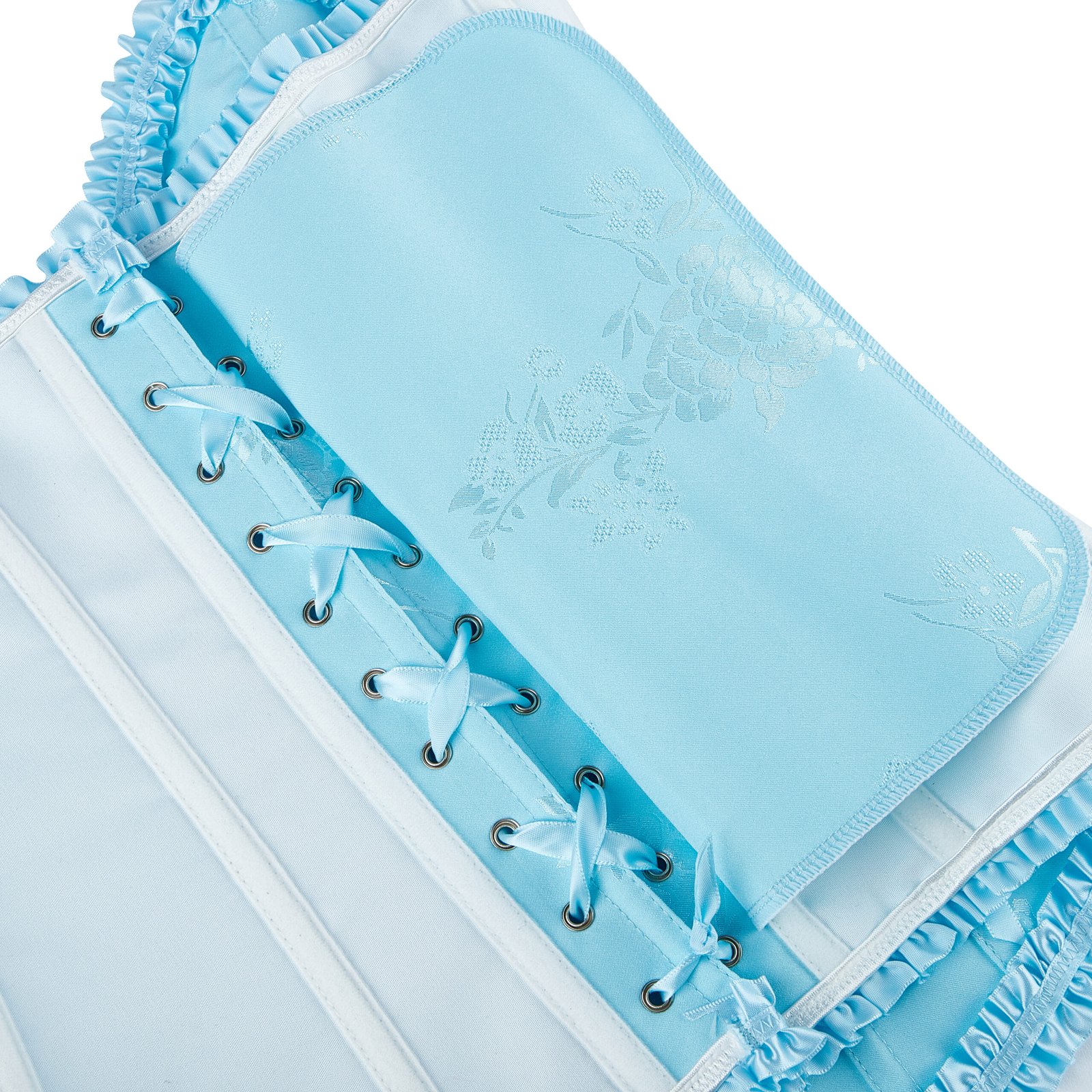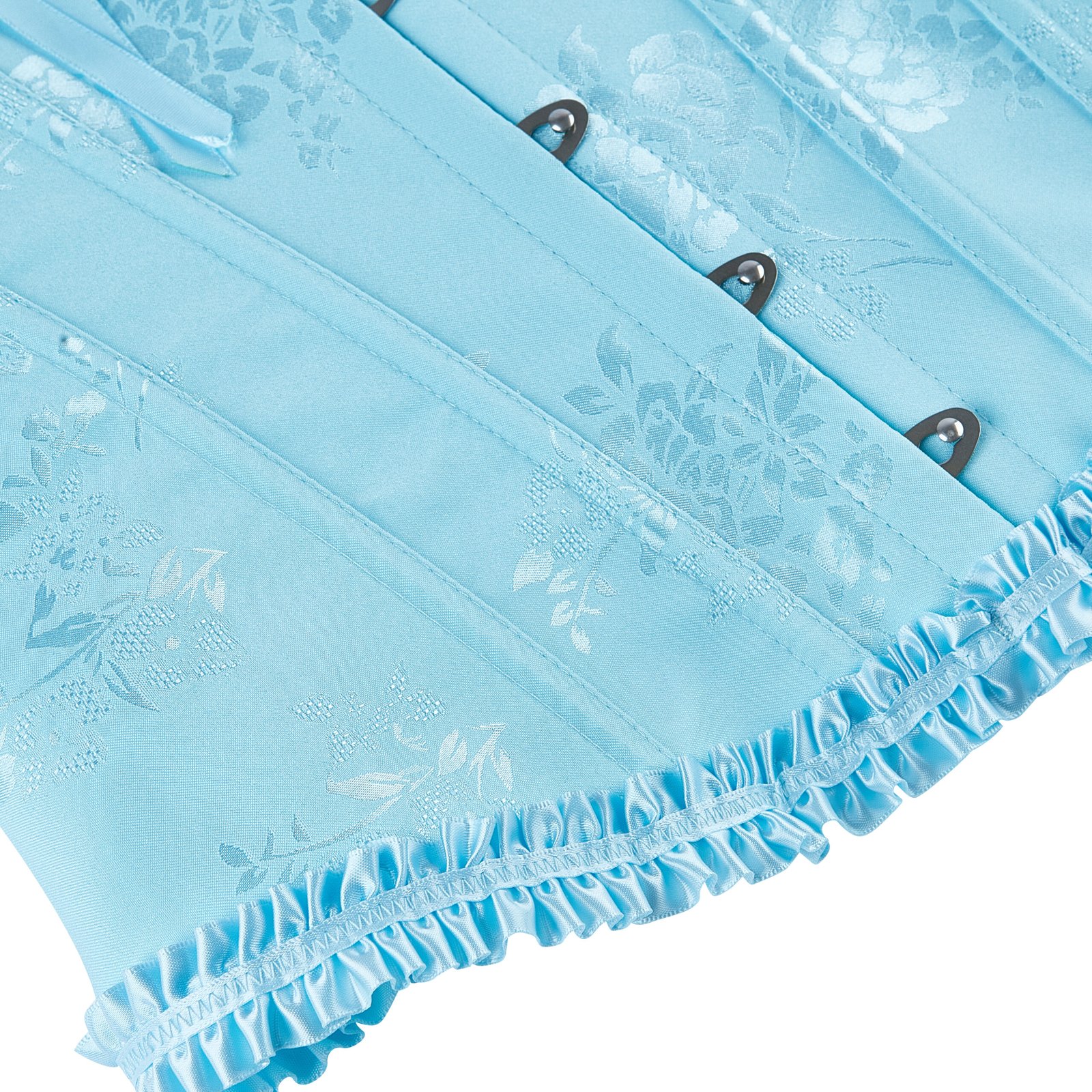This corset is made from high-quality satin with floral jacquard embroidery and ruffled trim accents. It features a structured front busk, adjustable lace-up back with ribbon ties, and includes a modesty panel. Suitable for various styling needs, it pairs effortlessly with skirts, jeans, or lingerie bottoms for versatile wear.