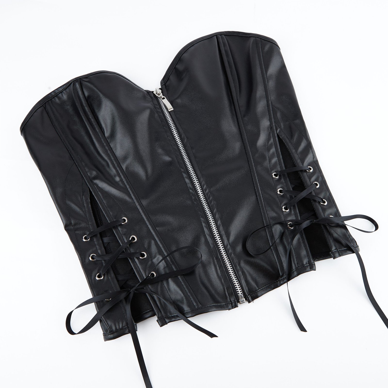 Function meets fashion with a smart double-closure system: a central front zipper for quick wear and adjustable lace-up sides for a customized fit. The back also features a lace-up detail for added support and styling control. This design ensures security and adaptability while highlighting the corset’s edgy charm. Whether you’re dancing or posing, you stay secure while looking sleek and fierce all night long.