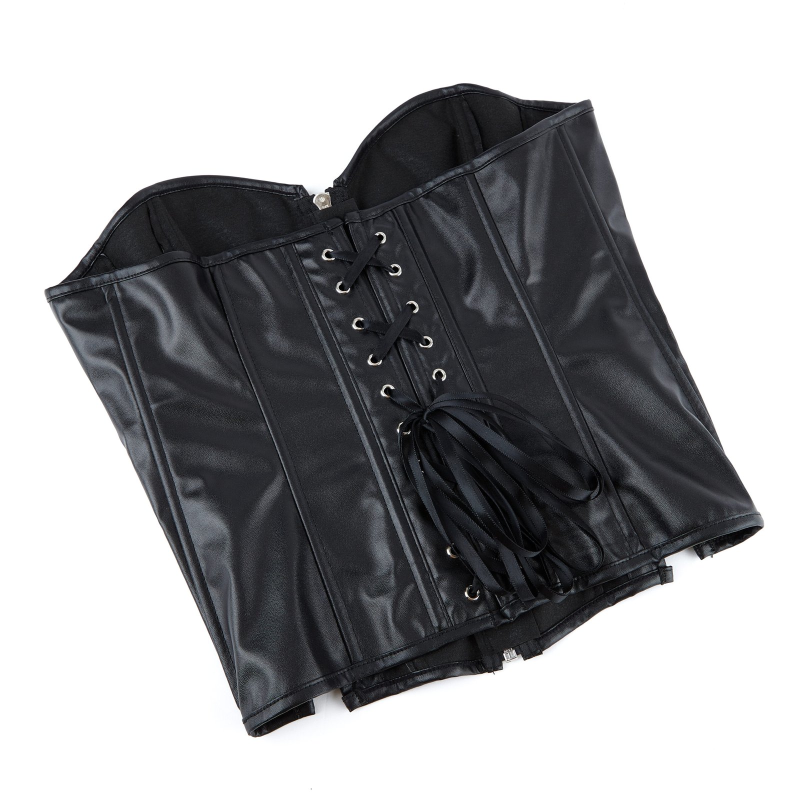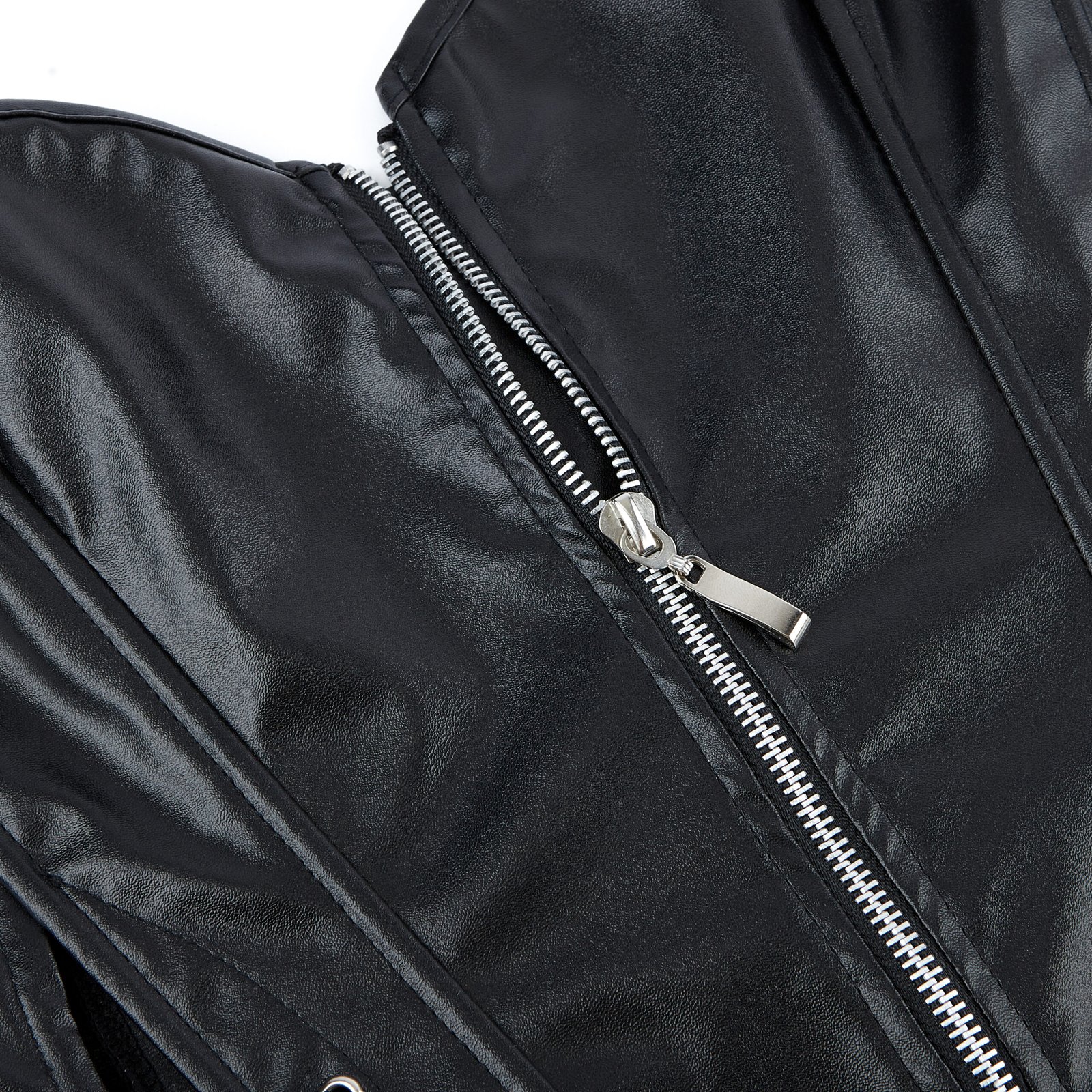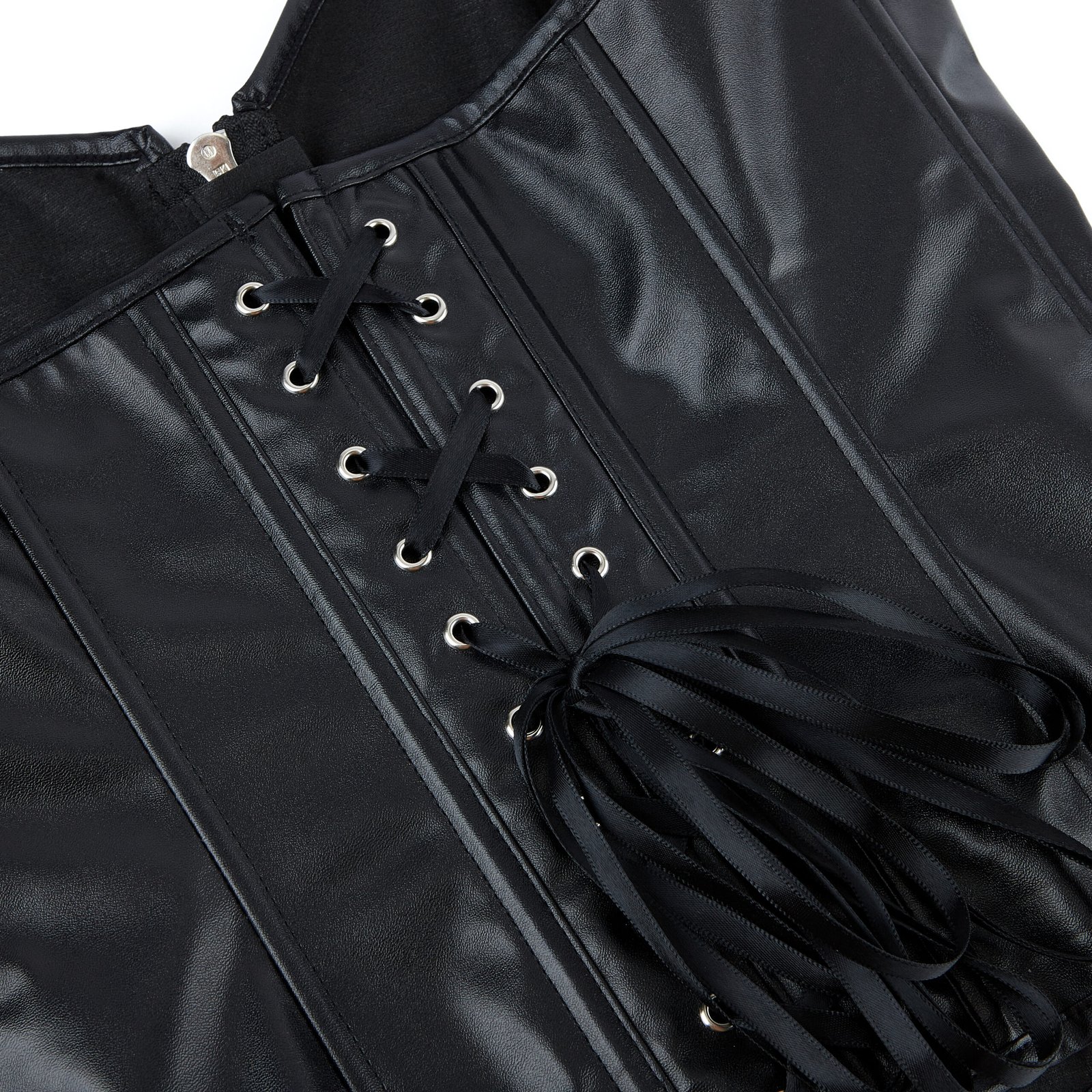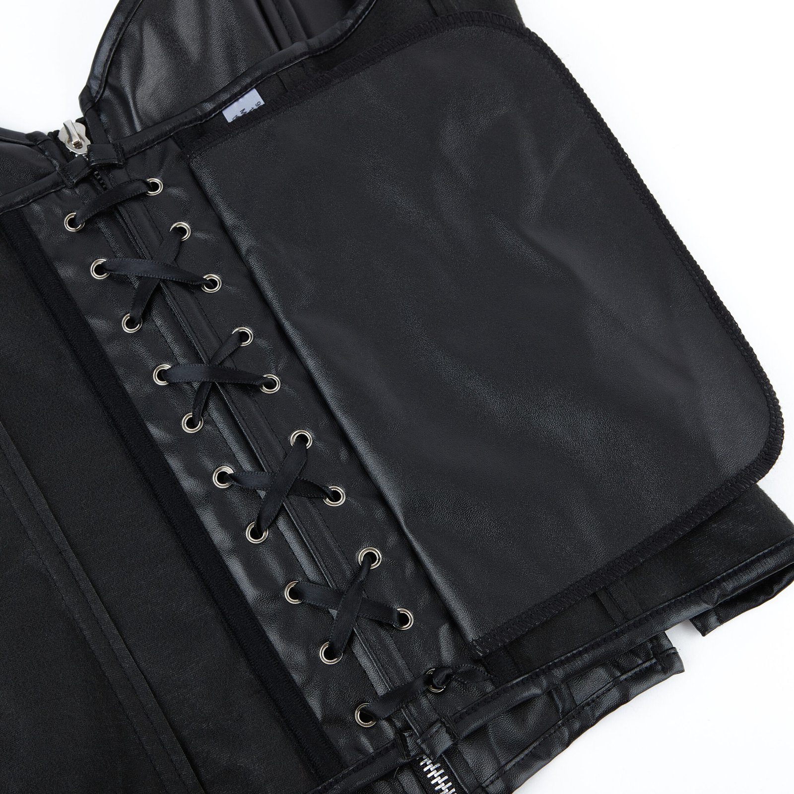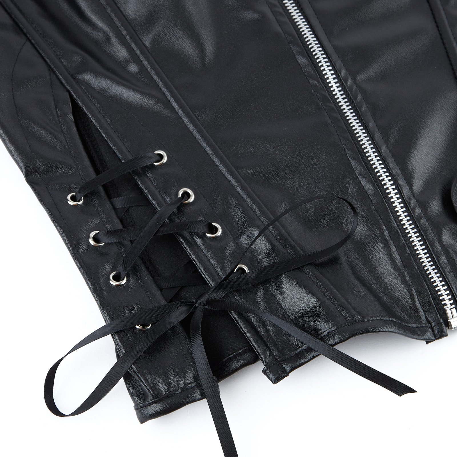 Made from high-quality faux leather, this corset includes a central zipper, side and back lace-up closures, and steel boning for light shaping. Its soft lining ensures comfort, while the glossy black finish adds a dramatic, high-fashion look. Ideal for edgy styling or elevated layering.